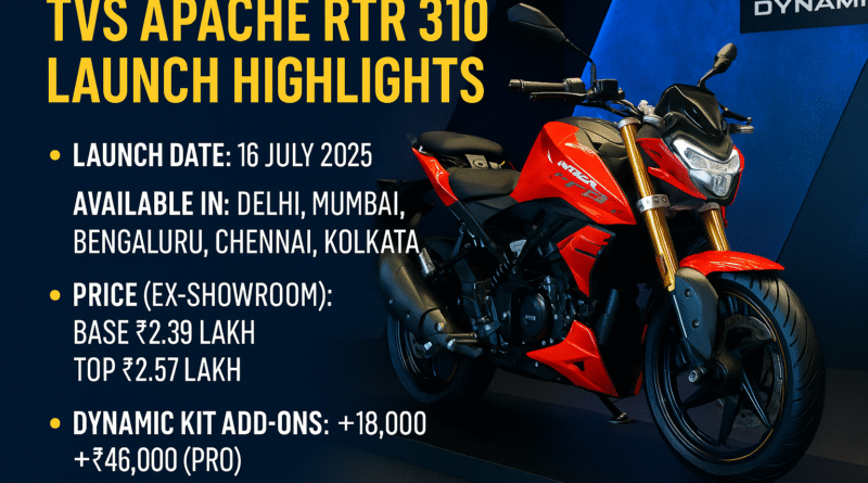 Read More🚀 TVS Apache RTR 310 Launch Highlights 📅 Launch Date: 16 July 2025📍 Available in: Delhi, Mumbai, Bengaluru, Chennai, aur